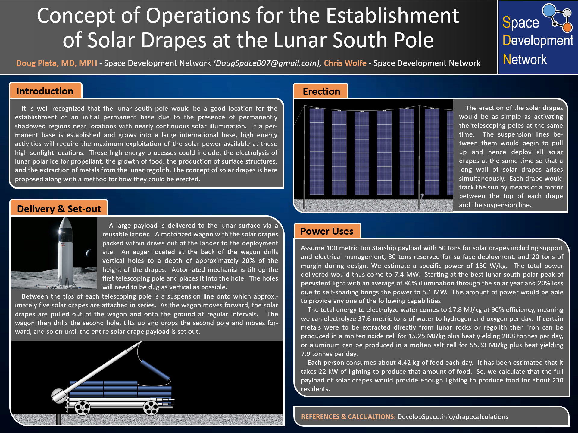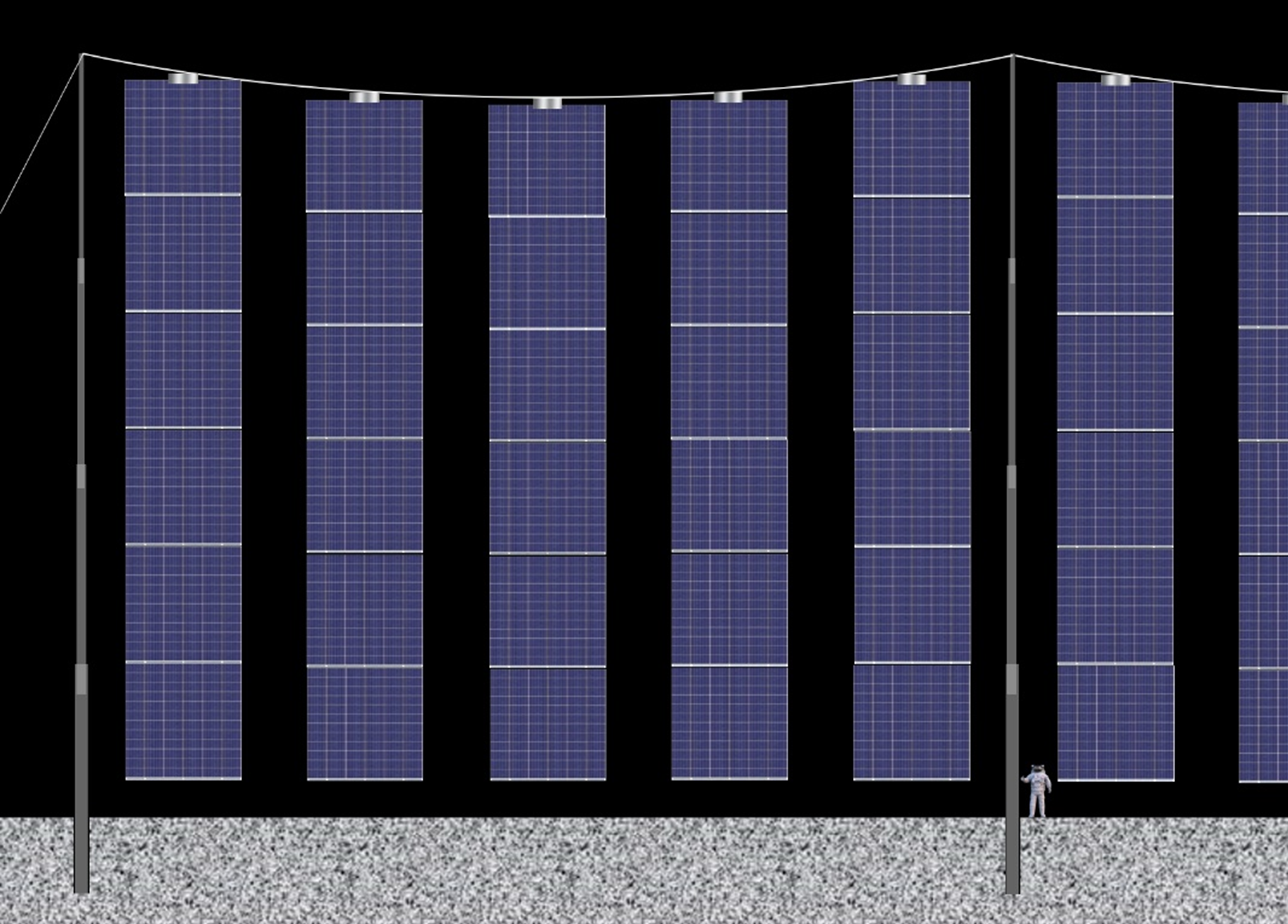 That puts us at about 80 kg per blanket. Suppose we leave two meters between blankets to reduce self-shading and we space support poles at the 30-meter blanket height apart; that's 15 blankets or 1,200 kg per span. That's also 246 kW per span or ~311 amps, which would require 60 meters of 4/0 cable (~30 kg) per span (30m across and 30 m down, and more than strong enough to support the load of the span). Given the uncertainties involved we suggest using a 30% mass margin, which gives a working figure of 1600 kg per span or a static load of 2600 N in lunar gravity. Supports are likely to be made of carbon fiber composite sandwich core structures (3).