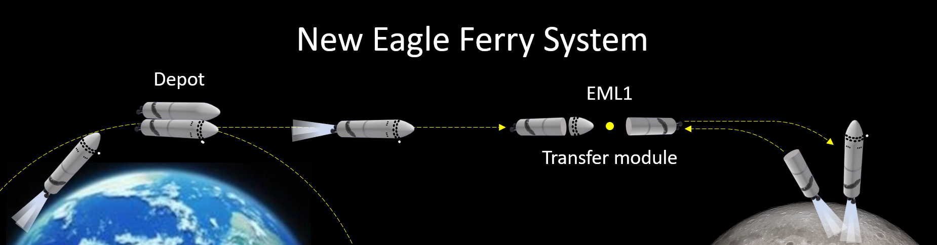 What could Blue Origin's lunar transport system look like? It would not be necessary for Blue Origin to develop a launcher larger than the New Glenn (i.e. the New Armstrong). But it would be entirely necessary for Blue Origin's Earth-Moon vehicle to be refuellable in LEO. However, we believe that LEO refueling is entirely doable. There are options for the degree of reusability of the New Glenn upper stage. Likewise, the Earth-Moon vehicle could either be the New Glenn upper stage (like how Starship is the upper stage of the Super Heavy - Starship) or the upper stage engines could be separated, re-entered, and captured mid-air for reuse while the fairly cheap upper stage tankage could be either discarded or transported to the Moon as payload for its metals. To maximize efficiency, the cislunar transportation system should be broken up into legs to take advantage of staging between vehicles. Cargo and crew modules could be handed between vehicles in order to reduce the number of propellant transfers that would be needed.